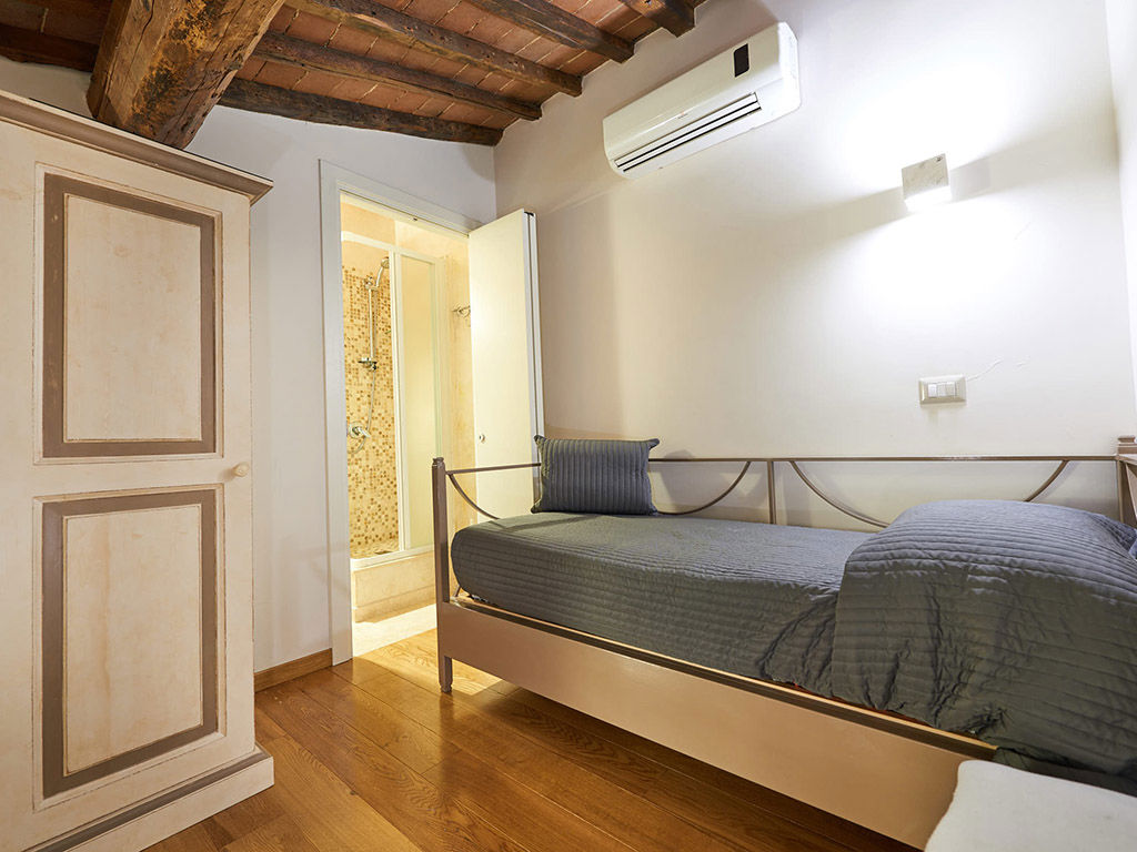 Nel soppalco si trovano la seconda camera con letto singolo e un altro bagno.